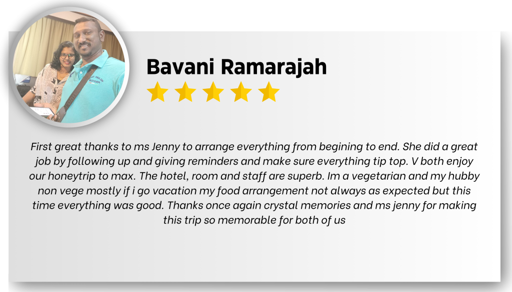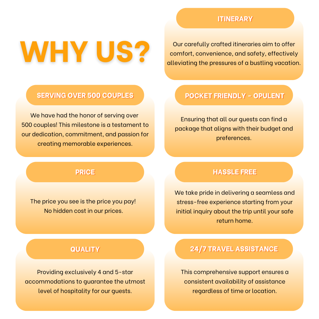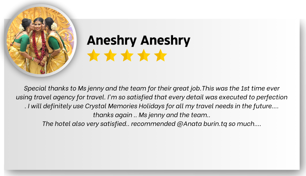 Welcome to Crystal Memories Holidays, where we specialize in arranging unforgettable vacations exclusively for couples. Our bespoke packages include delightful bed decorations and intimate candlelight dinners, ensuring a romantic ambiance throughout your stay. We offer private transfers, luxurious accommodations, and meticulously planned tours, catering to every budget from pocket-friendly to opulent. Regardless of the package you choose, we guarantee a memorable experience filled with exceptional hospitality. We pride ourselves on our unwavering commitment to quality, offering only 4 and 5-star accommodations to ensure the best hospitality for our guests. Our meticulously planned itineraries are designed to provide comfort, convenience, and safety, eliminating the stress of a hectic vacation. While we do not customize itineraries, our carefully curated plans promise a seamless and enjoyable experience, personalized with care for each couple. Don’t wait any longer to create precious memories together. Let us handle the planning and organizing, so you can simply hold your partner’s hand and embark on a romantic vacation.